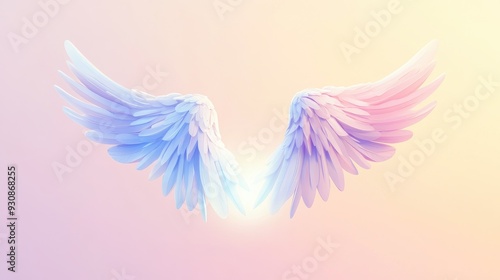 Adorable cartoon angel wings with soft, rounded feathers and a gentle light aura, floating in a pastel gradient background.
