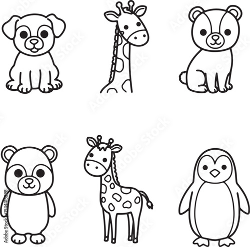 Adorable Cartoon Animal Illustrations Puppy, Giraffe, Polar Bear, Panda, Penguin Drawings