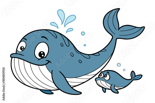 Adorable cartoon blue whale and calf swimming together in the ocean with water splashes
