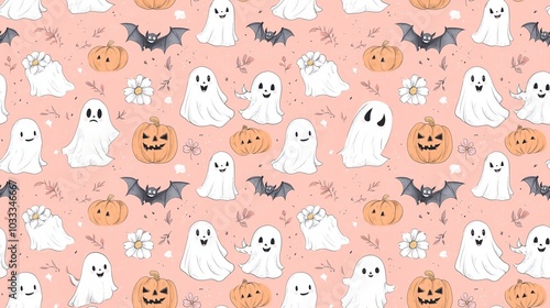 Adorable Cartoon Ghosts, Pumpkins, and Bats with White Flowers and Pink Vibes. Fun and Whimsical Halloween-Inspired Illustration in a Playful, Soft Color Palette.