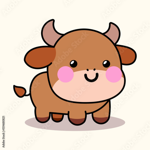 Adorable cartoon illustration of a happy smiling brown ox, bull, or calf. Cute kawaii farm animal character perfect for kids, nursery decor, and design projects. Isolated vector style.