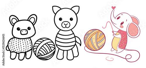 Adorable cartoon illustrations of cute animals, yarn balls and love concept for children's designs and crafts
