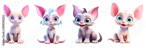 Adorable Cartoon Kittens with Big Eyes and Colorful Fur Sitting in a Row, Isolated , on transparent background