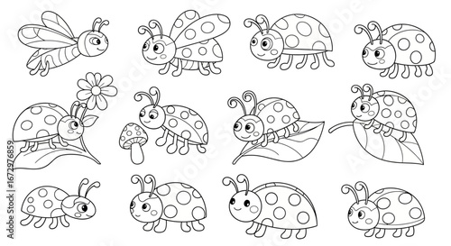 Adorable Cartoon Ladybugs and Insects Outline for Coloring Book on Isolated White Background