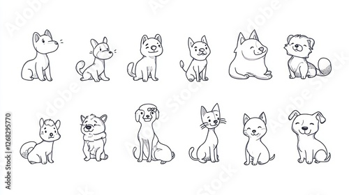 Adorable cartoon puppies and kittens sitting; white background; pet adoption