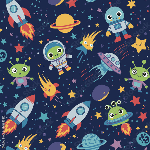 Adorable cartoon rockets, planets, aliens, and astronauts create a whimsical space-themed seamless pattern, perfect for kids' textile designs and vibrant backgrounds.
