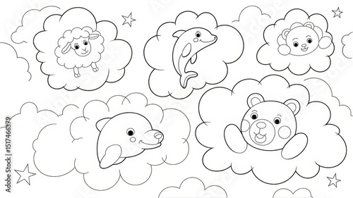 Adorable cartoon sheep, dolphins, lion cubs, and teddy bears joyfully leaping on fluffy clouds create a whimsical scene, ideal for children's books and playful designs