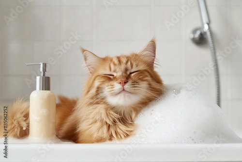Adorable Cat Enjoying Pampering Session in Pristine Bathroom with Shampoo