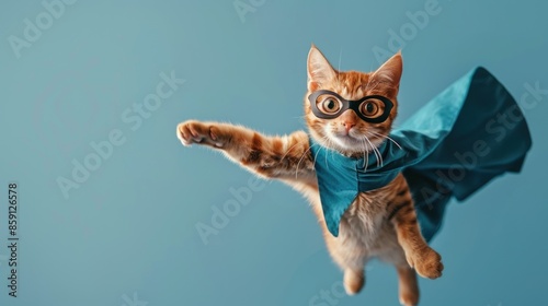 Adorable cat in a superhero cape and mask on a light blue background, the concept of a superhero, super cat, leader, funny animal studio shot.