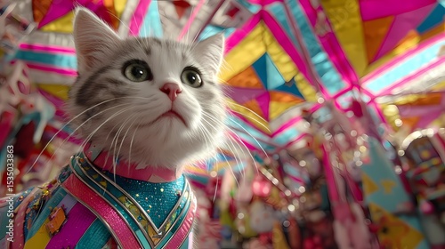 Adorable Cat in Colorful Costume Surrounded by Festive Decorations