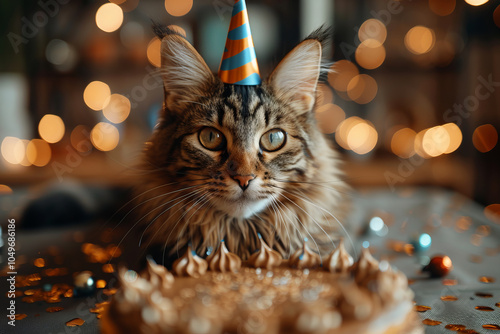 Adorable cat wearing a festive party hat, sitting by a delicious birthday cake surrounded by sparkling lights and confetti in a cheerful celebration setting.