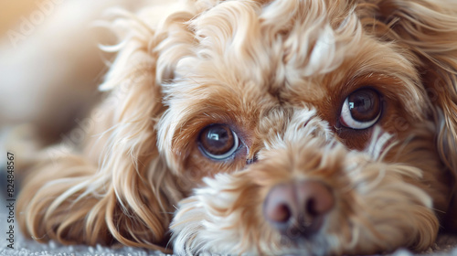 Adorable cavapoo puppy close up. A close up portrait of a cute Cavapoo puppy dog with big brown eyes and fluffy fur.