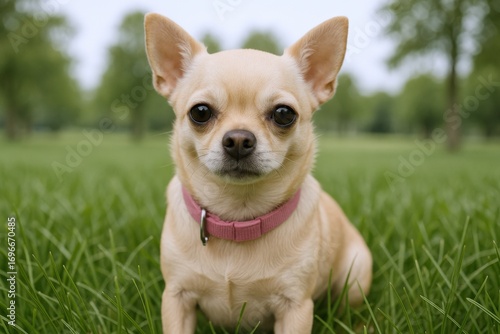 Adorable Chihuahua Portrait Sitting on Green Grass in a Park, Wearing Pink Collar and Looking at Camera