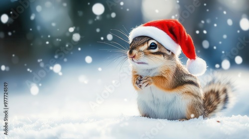 adorable chipmunk dressed as santa claus in snowy winter wonderland animal photography