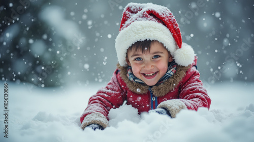 Adorable Christmas Portrait of Kid in Santa Hat Enjoying Snowy Winter Scene - Perfect for Holiday Cards & Seasonal Campaigns