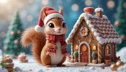 Adorable Christmas Squirrel in Santa Hat Visits Gingerbread House in Snowy Winter Wonderland Scene