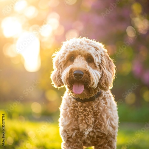 Adorable Cockapoo Dog Enjoying Golden Hour in a Sunny Field.