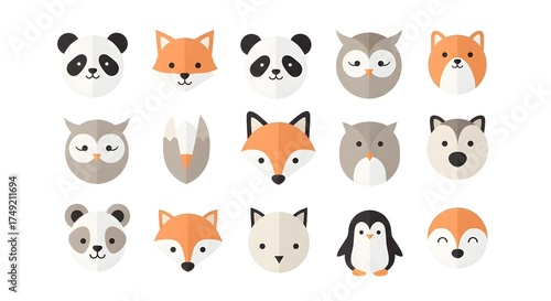 Adorable collection of cute flat design animal faces including pandas, foxes, owls, penguins, and wolves for playful designs