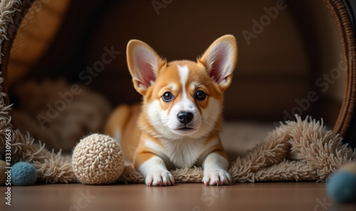 Adorable corgi puppy lounging inside a cozy space, exuding cuteness and charm. Perfect for pet-related marketing and social media.