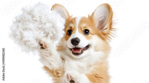 Adorable corgi puppy playing with fluffy cloud cotton in bright studio light playful and energetic pet friend happiness canine