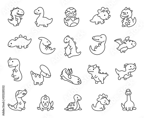 Adorable dinosaur character set featuring cute kawaii prehistoric reptiles in various poses and emotions, including hatching, flying, roaring, and resting in a charming jurassic world