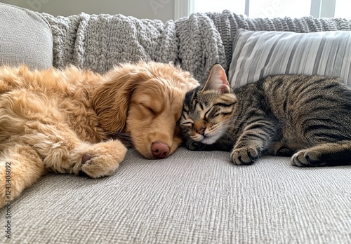 Adorable dog and cat sleeping together on a cozy couch, showcasing friendship and comfort in a warm indoor setting with natural light