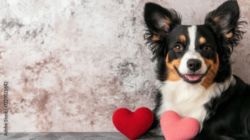 Adorable Dog Posing with Valentine Hearts Against Textured Wall