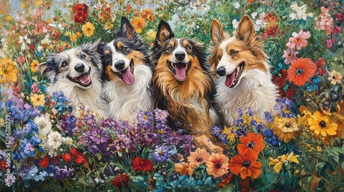 Adorable dogs posing in a vibrant garden full of colorful flowers.
