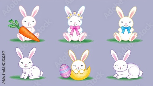 Adorable Easter Bunnies Six Cute Cartoon Rabbits with Carrots Eggs and Flowers