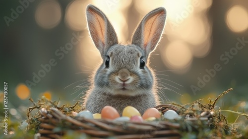 Adorable Easter Bunny in a Nest with Colorful Eggs