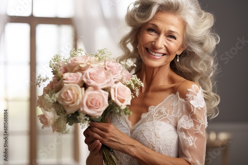 Adorable elderly smiling bride in a wedding dress holds a wedding bouquet of roses in a room with a window