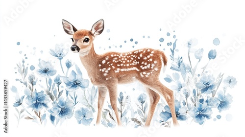 Adorable fawn amidst delicate blue wildflowers.