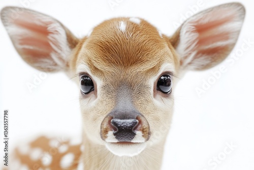 Adorable fawn with big, curious eyes, soft fur, and delicate features.