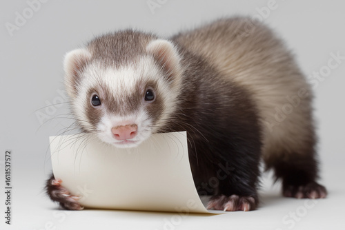 Adorable ferret holding a blank white paper for your message. Cute animal portrait with copy space on a gray studio background.