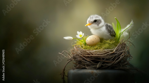 Adorable Fluffy Bird Nestled Among Flowers and Egg in a Rustic Nest.