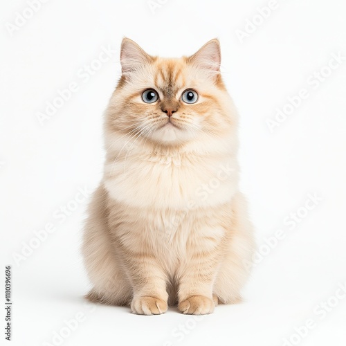 Adorable fluffy British Longhair cat with bright blue eyes, sitting gracefully against a plain background, capturing the essence of playful companionship.