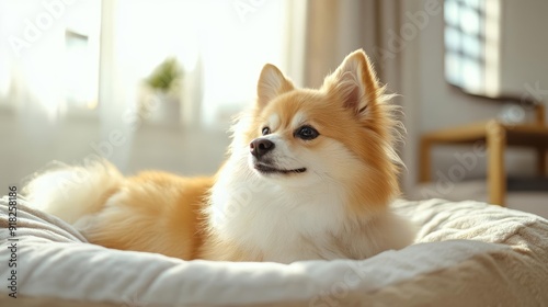 Adorable fluffy dog lounging on a soft bed in a luxurious pet hotel, Generative AI, pet care concept
