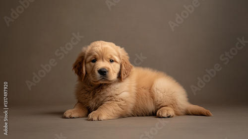 Adorable fluffy golden retriever puppy sitting playfully on soft grass with bright eyes and joyful expression