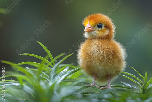 Adorable fluffy orange chick standing on vibrant green foliage in a serene natural setting