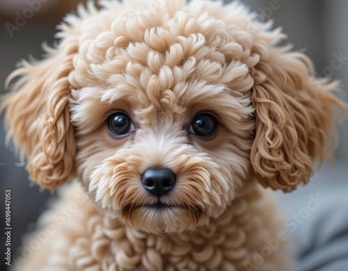 Adorable fluffy poodle puppy with expressive dark eyes looking intently forward