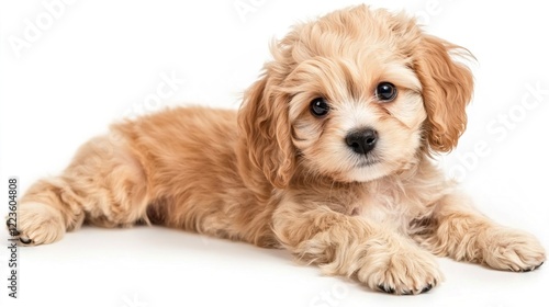 Adorable fluffy puppy resting on white background with charming eyes