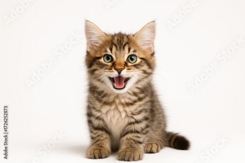 Adorable fluffy tabby kitten mid meow with green eyes isolated on pure white background studio lighting playful expression cutout for designers
