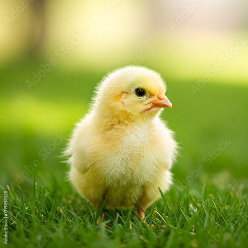 Adorable fluffy yellow baby chick standing on vibrant green grass outdoors. Cute newborn bird portrait, symbol of spring, Easter, and new life. Blurred background.