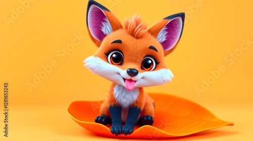 Adorable fox cub with big eyes and fluffy fur sits playfully on a leaf, sticking out its tongue against a bright orange background.