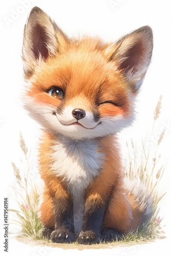 Adorable fox kit winking playfully, sitting amidst tall grass
