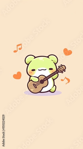 Adorable Frog Plays Acoustic Guitar with Love, Music Notes Background Illustration