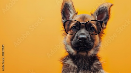 Adorable German Shepherd puppy wearing glasses against orange background, showcasing intelligence and cuteness in a close-up portrait.