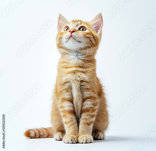 Adorable Ginger Kitten Looking Up Cute Orange Tabby Cat Studio Portrait Playful Feline Isolated on White Background : Generative AI