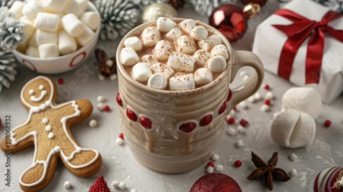 Adorable gingerbread man and holiday cocoa with marshmallows, cookie, and Christmas decorations