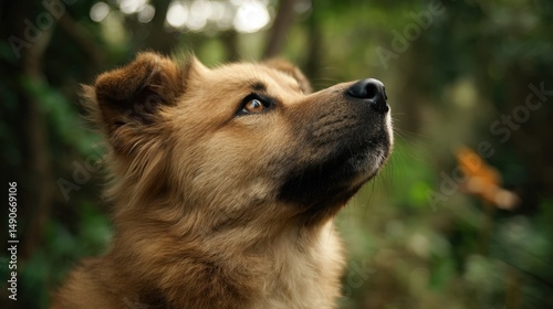 Adorable Golden Brown Dog Looking Upwards in Lush Green Forest Nature